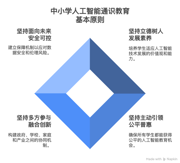 在保障体系方面,《指南》提出了三个层面的重点举措:教育行政统筹、家庭协同育人、社会企业参与,三位一体,形成推进人工智能教育的强支撑系统。这一保障体系的提出,标志着AI教育正在从“试点驱动”向“体系驱动”演进,构建起由政府引导、学校主导、家庭协同、社会参与的立体支撑结构,为人工智能通识教育可持续发展奠定了制度根基和行动共识。